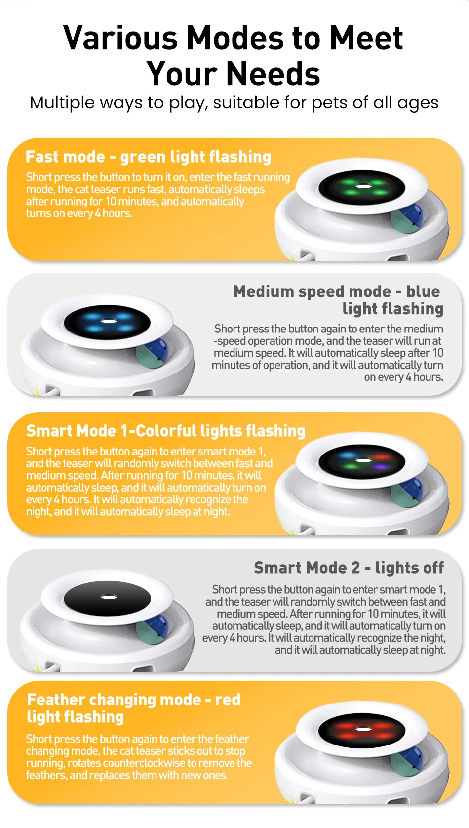 - Five interactive modes: automatic feather chase, random patrol, gentle nudge, and more to spark hunting instincts.