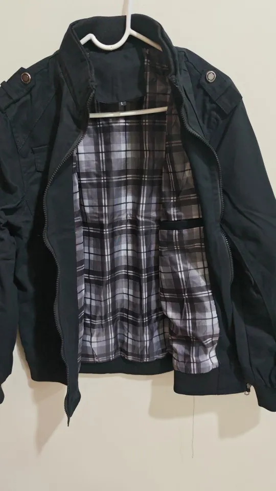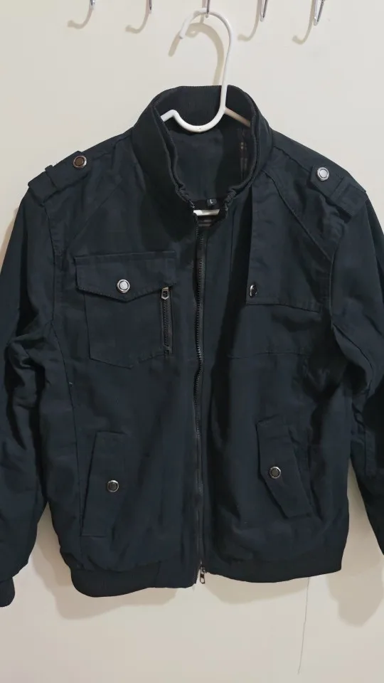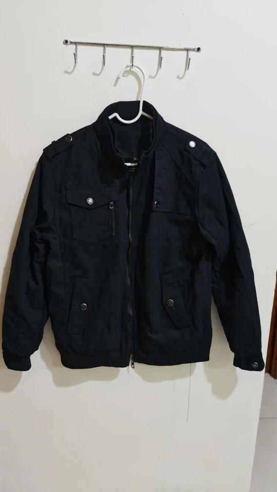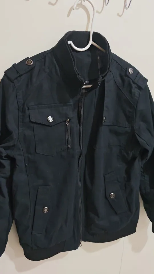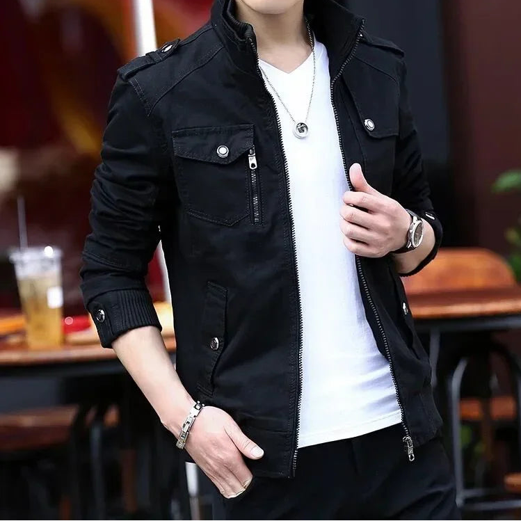 This men's jacket offers a stylish blend of military-inspired design and everyday wearability. In solid black, it features a stand collar and multiple pockets, adding both functionality and a touch of ruggedness. The jacket is ideal for transitioning between seasons, providing a comfortable and versatile outerwear option.