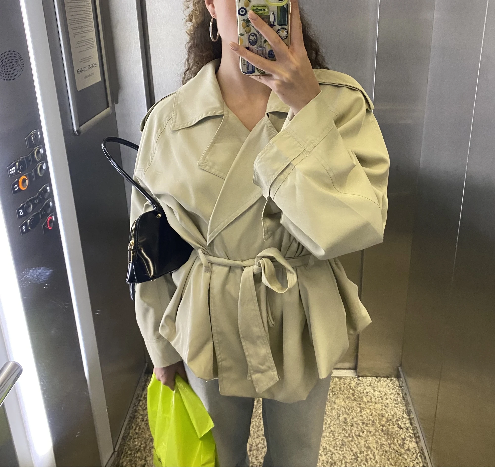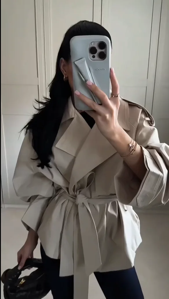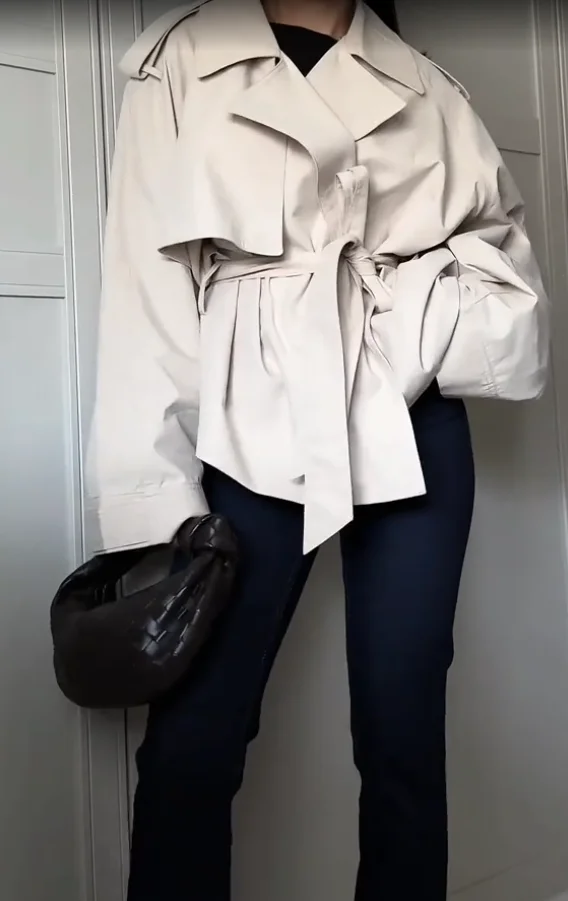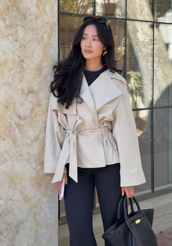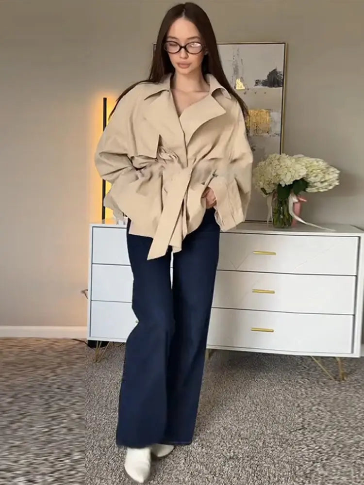This trench combines a modern, cinched silhouette with retro inspiration. The belt at the waist creates a flattering hourglass shape, while the wide, drop-shoulder sleeves and oversized collar add a relaxed, fashion-forward vibe. The lace-up detailing and premium fabric give it a chic, windbreaker-like feel, making it versatile for both casual days and dressier outings.