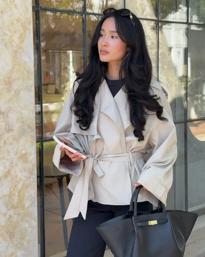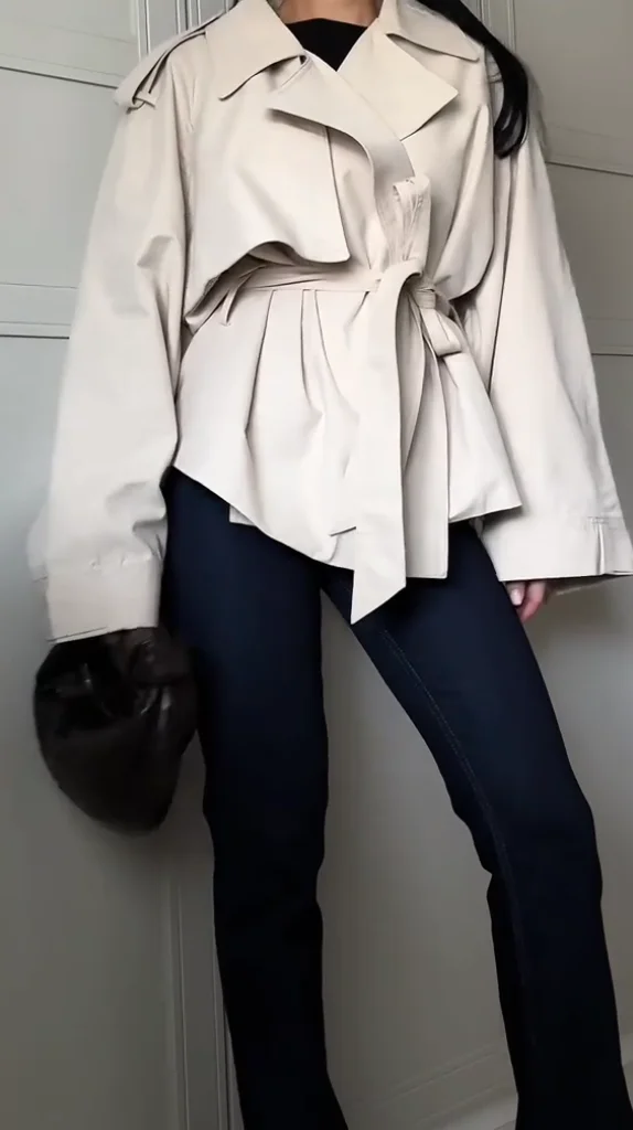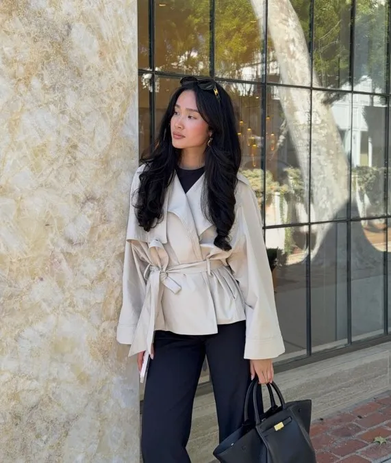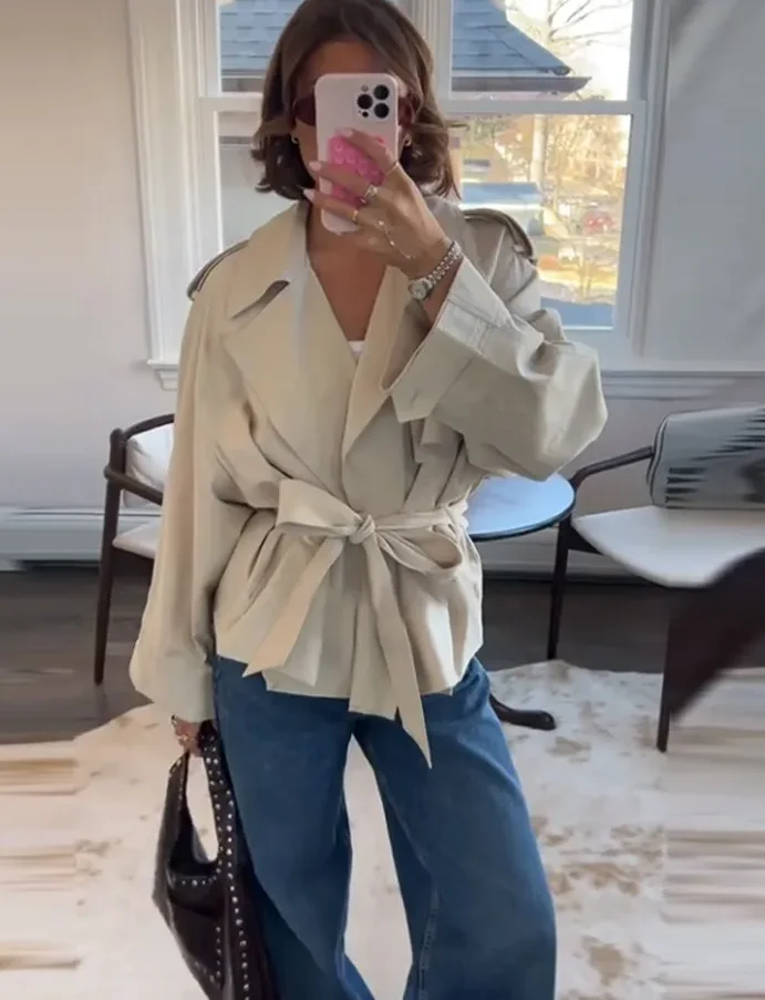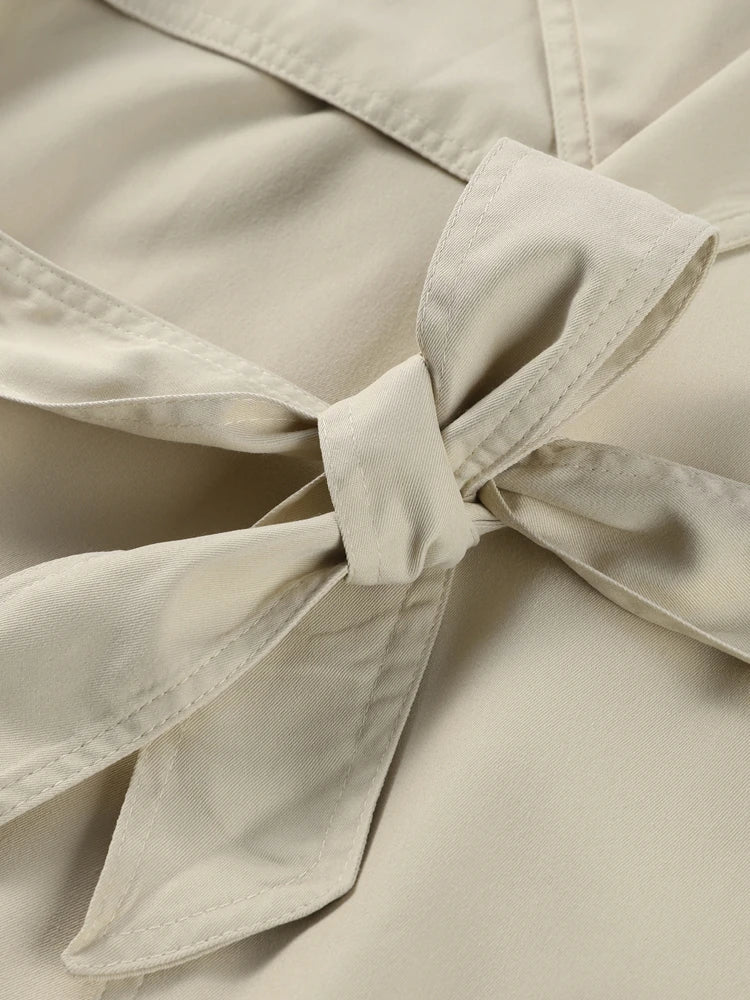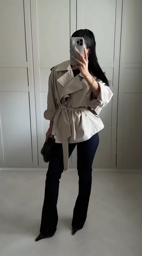 This trench combines a modern, cinched silhouette with retro inspiration. The belt at the waist creates a flattering hourglass shape, while the wide, drop-shoulder sleeves and oversized collar add a relaxed, fashion-forward vibe. The lace-up detailing and premium fabric give it a chic, windbreaker-like feel, making it versatile for both casual days and dressier outings.