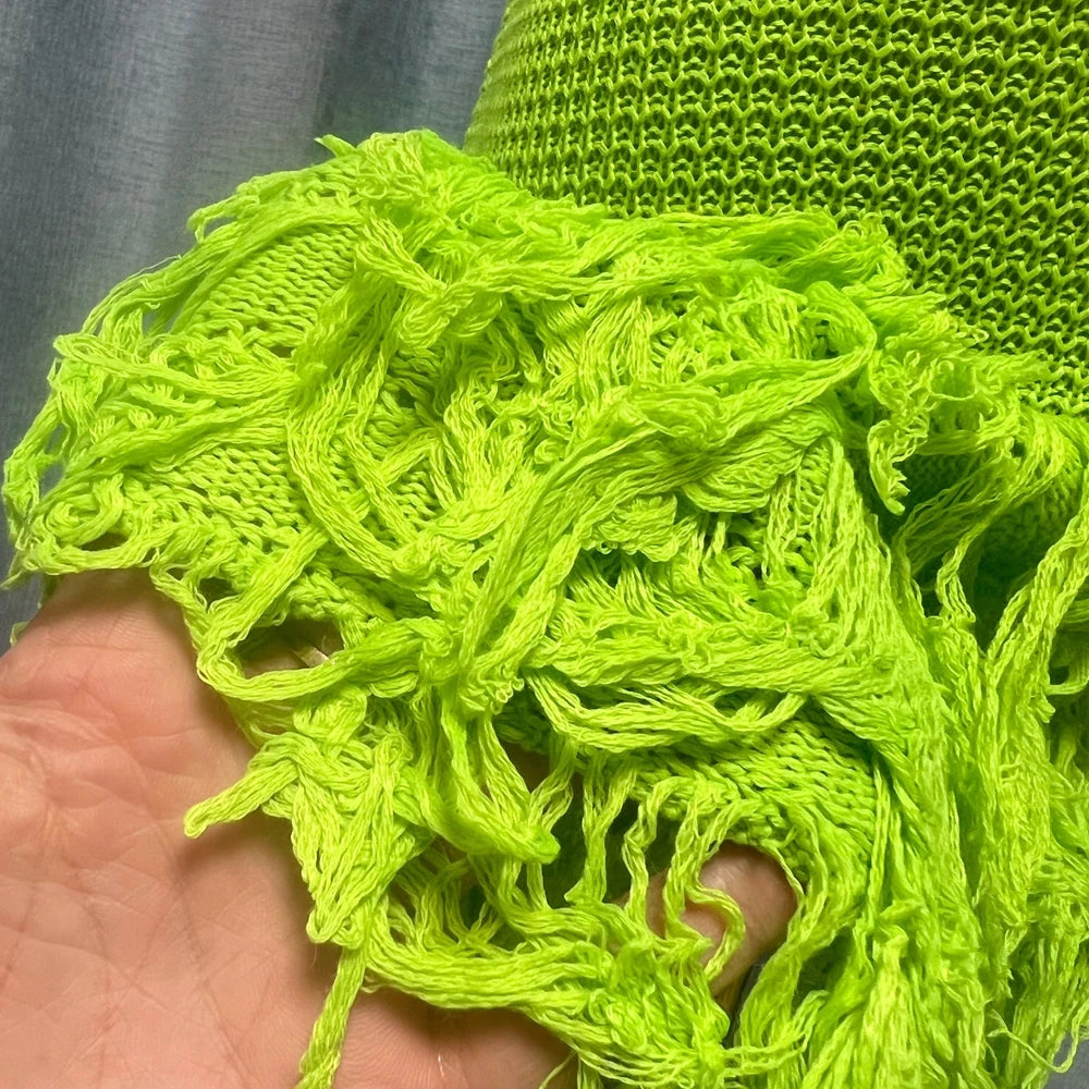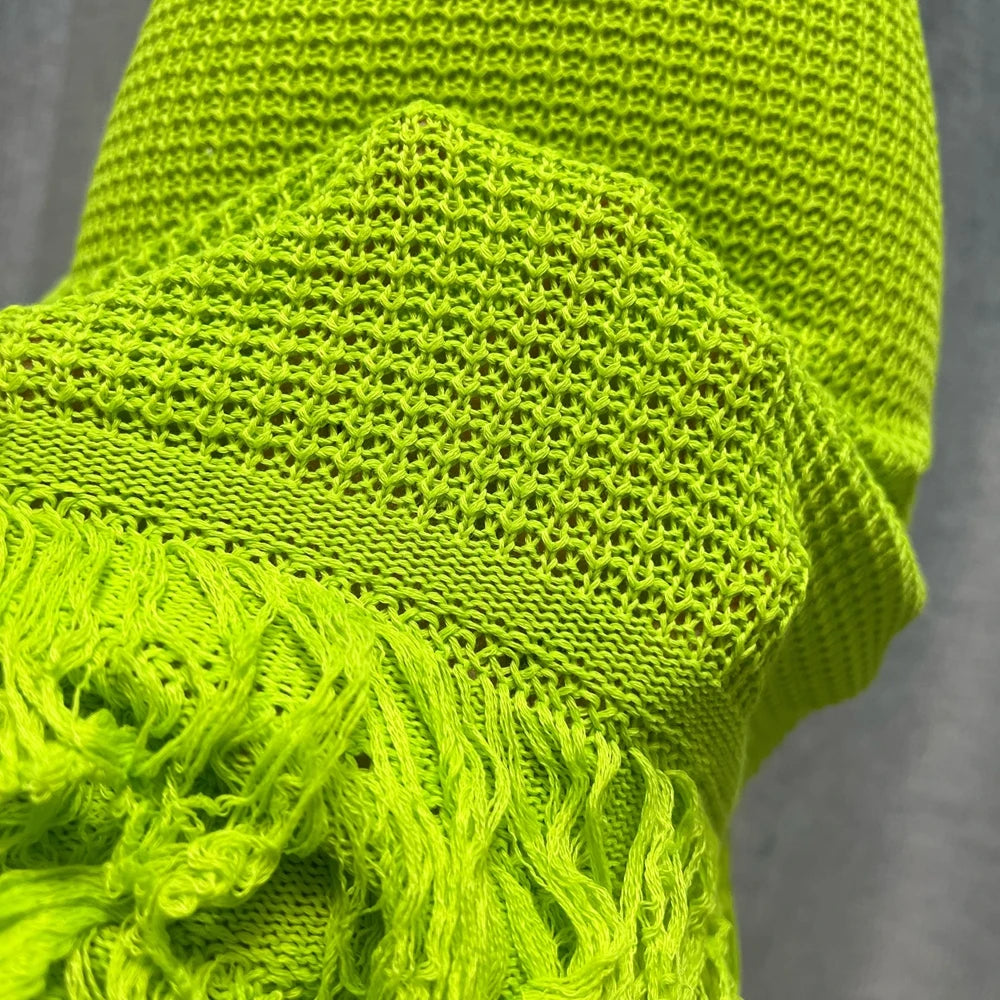 A vibrant neon-green knit mini dress with a sleeveless, bodycon silhouette and a playful fringe hem. The fitted style and bold color deliver a chic, beach-to-party look.
