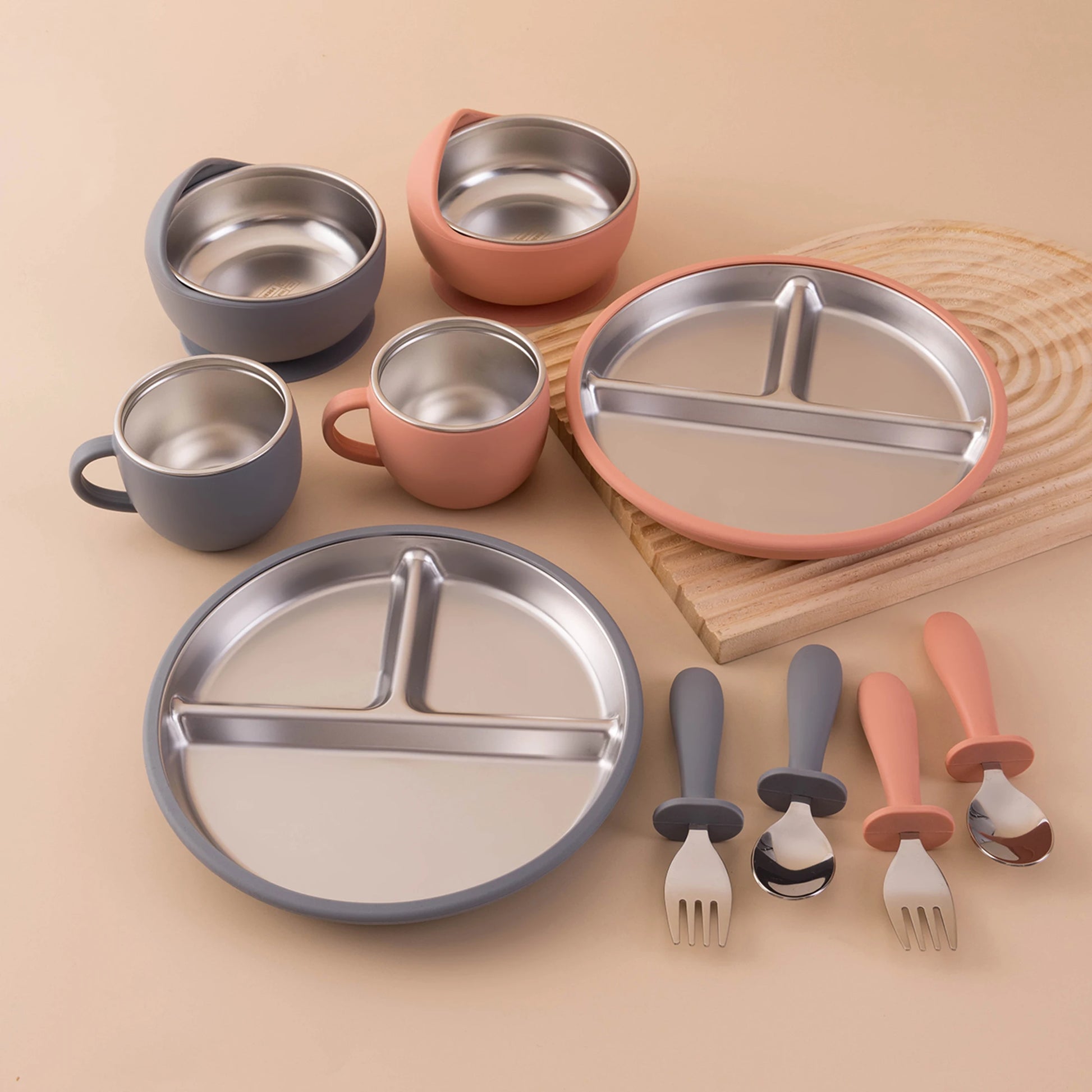 - The stainless steel plates and bowls are robust and durable, while the silicone utensils offer a comfortable grip for little hands. The materials are also free from PVC, latex, phthalates, and nitrosamines, providing peace of mind for parents.