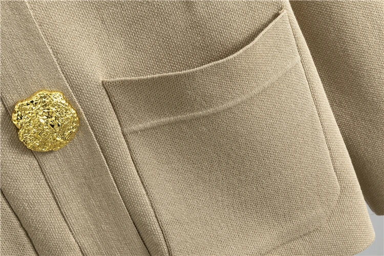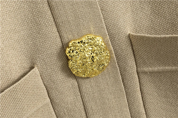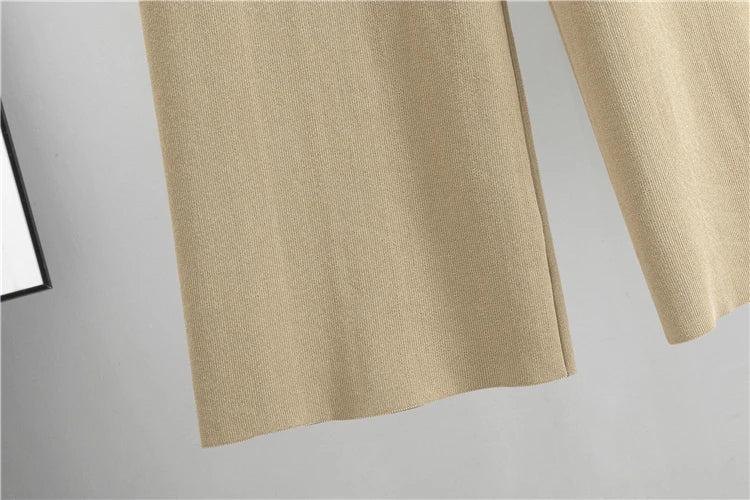A sophisticated tan knit two-piece set featuring a V-neck cardigan with gold buttons and two front pockets, paired with wide-leg knit pants with an elastic waist. The soft, monochrome tone and refined details make it ideal for spring casual to semi-formal looks.