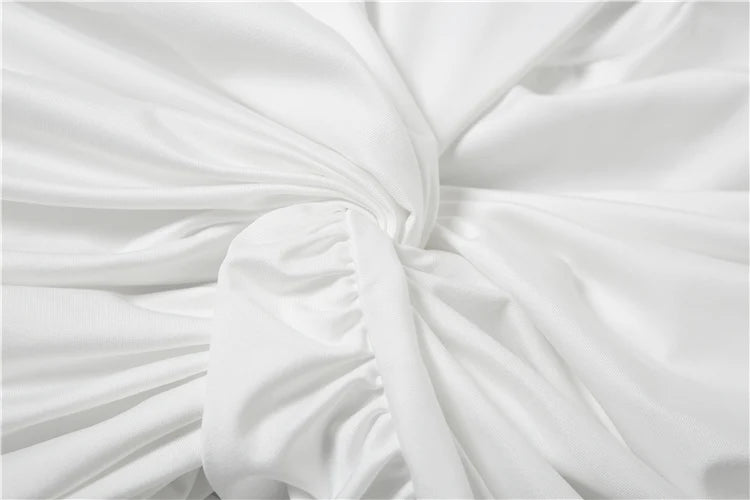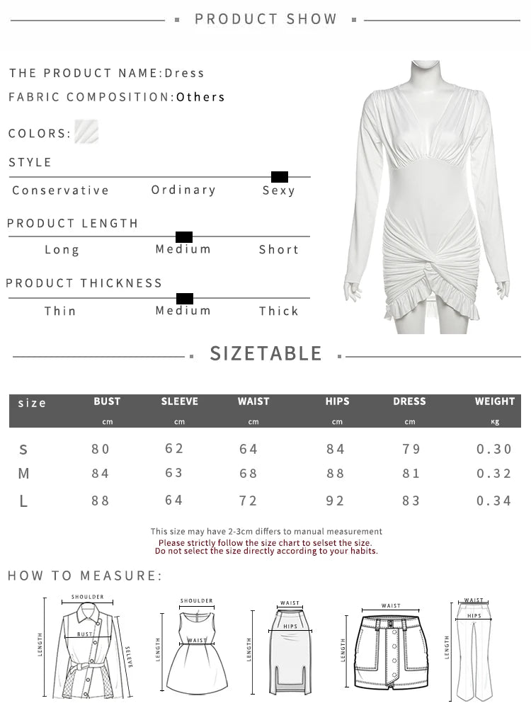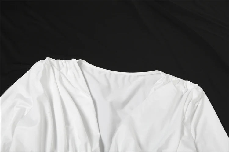 A chic white mini dress with a deep V-neck, long sleeves, and a ruched, knot-draped front. The ruched details and ruffled hem create a refined, party-ready silhouette.