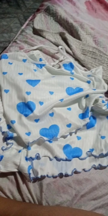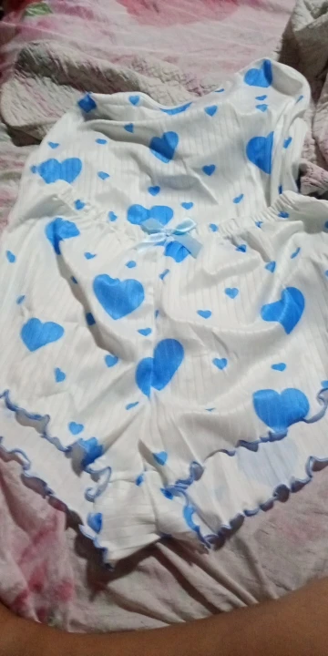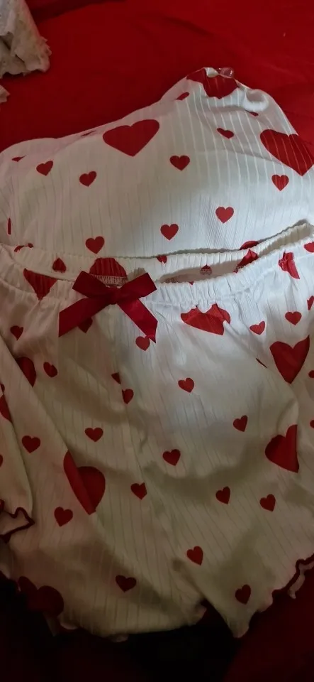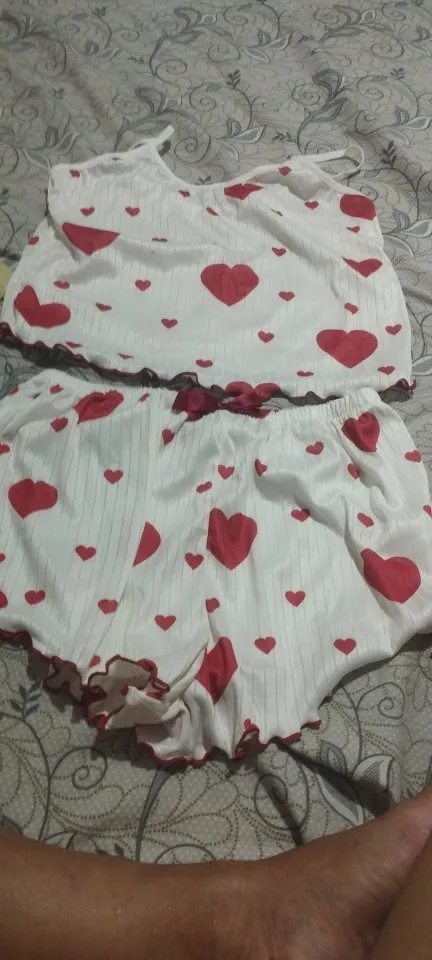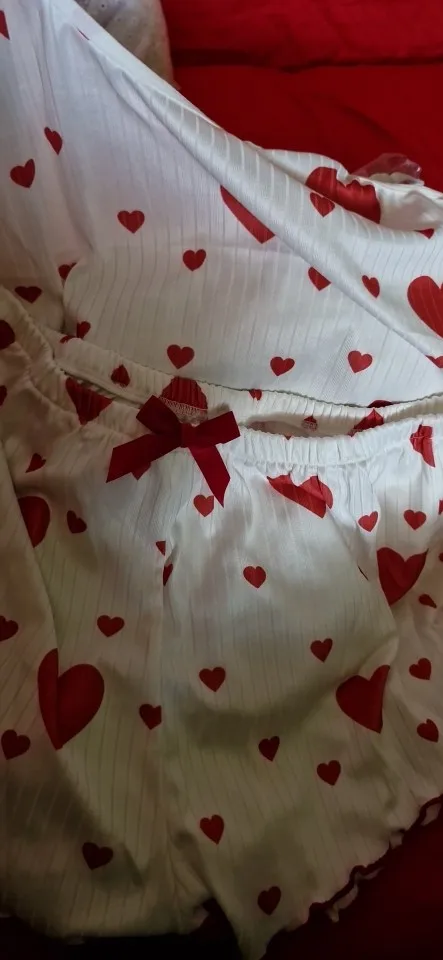 A cute pajama set featuring a spaghetti-strap ribbed tank top and matching shorts with red heart prints and red ruffle trim. Lightweight, breathable, and perfect for relaxed nights or playful loungewear.